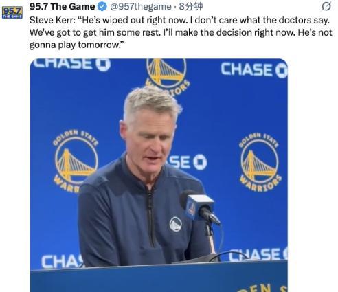 针对库里感冒的问题,科尔说不管医生怎么说,他决定明天对阵国王的比赛中,库里休战,不会登场比赛。